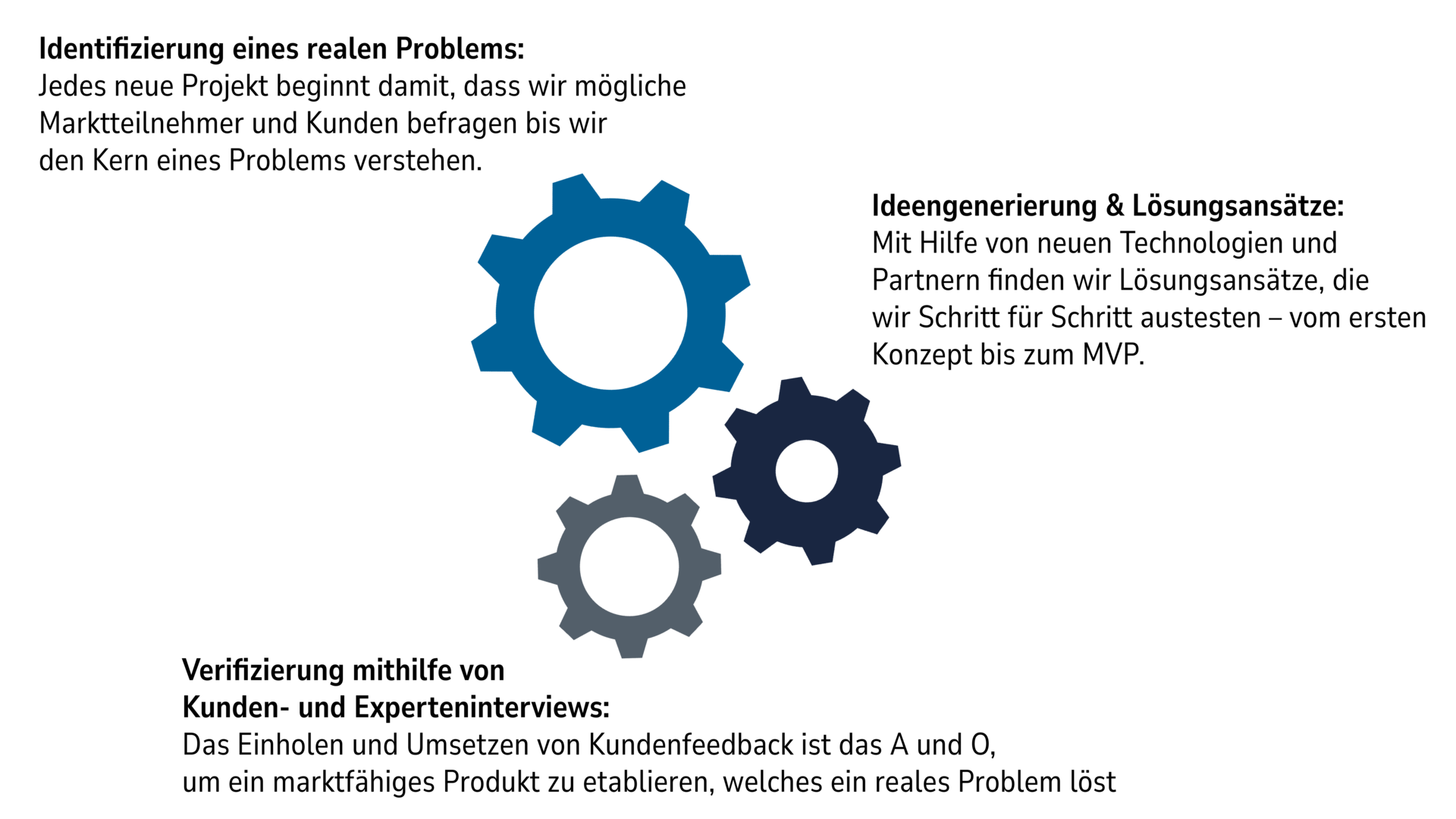 Unser Fokus liegt auf der Umsetzbarkeit und dem Erzielen des besten Ergebnisses. Dabei muss nicht immer der schnellste Weg der richtige sein. Agile Prozesse und das Lernen aus Erfahrungen und Fehlern sind feste Bestandteile unserer Arbeitsweise.