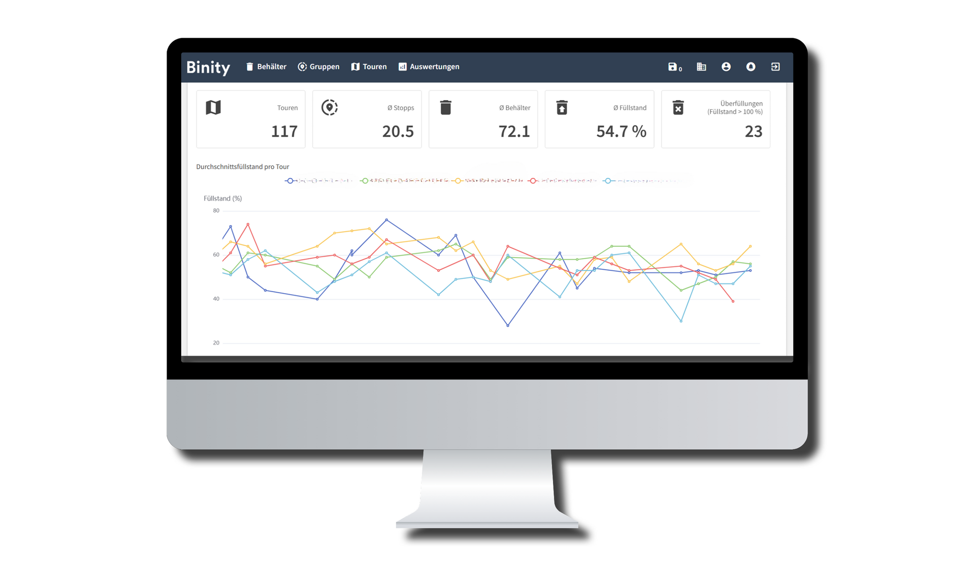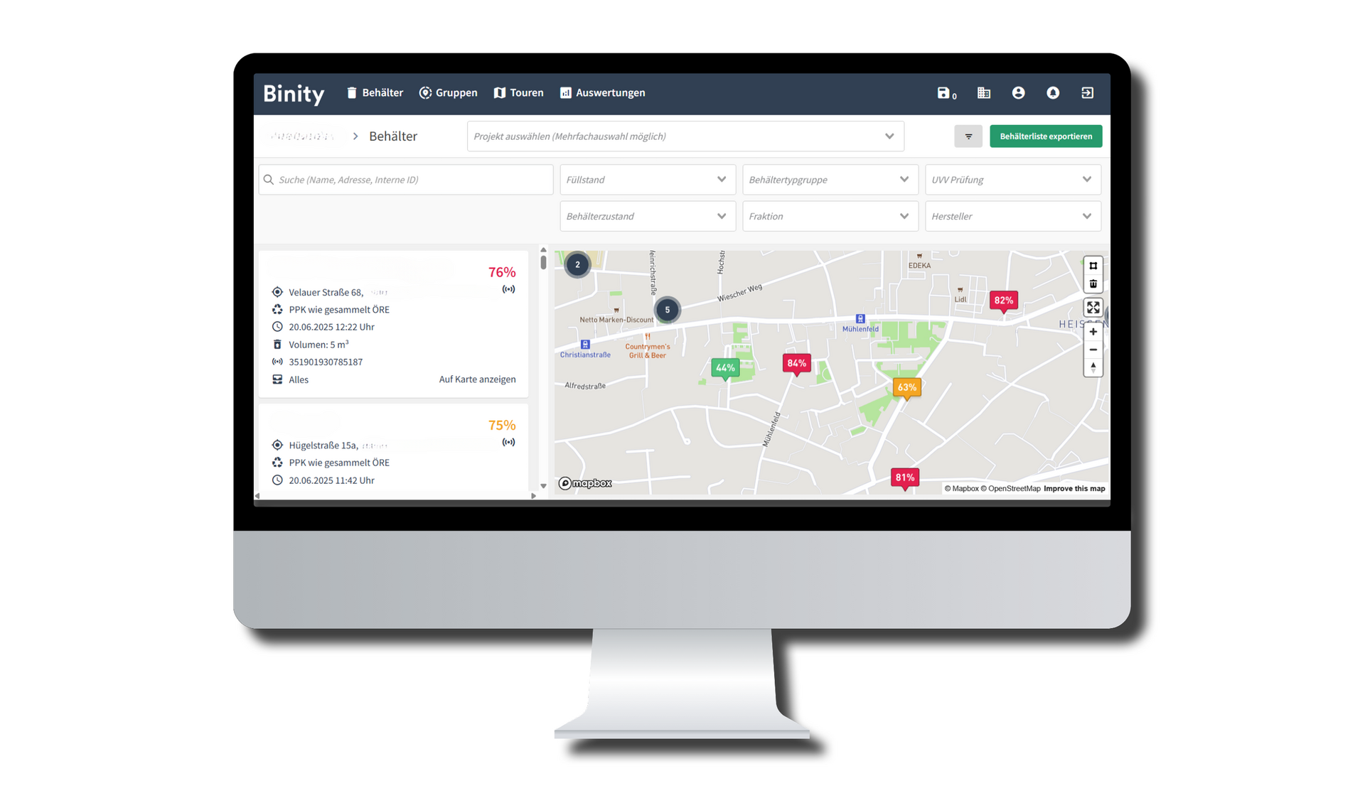 Im BINITY Dashboard haben Sie alle Füllstände Ihrer Behälter tagesaktuell im Blick und farblich markiert nach Füllgrad. Erreicht ein Container den von Ihnen definierten Grenzwert, wird automatisch ein Leerungsauftrag ausgelöst. So vermeiden Sie überfüllte Behälter und erhöhen die Planbarkeit Ihres Personal- und Ressourceneinsatzes.