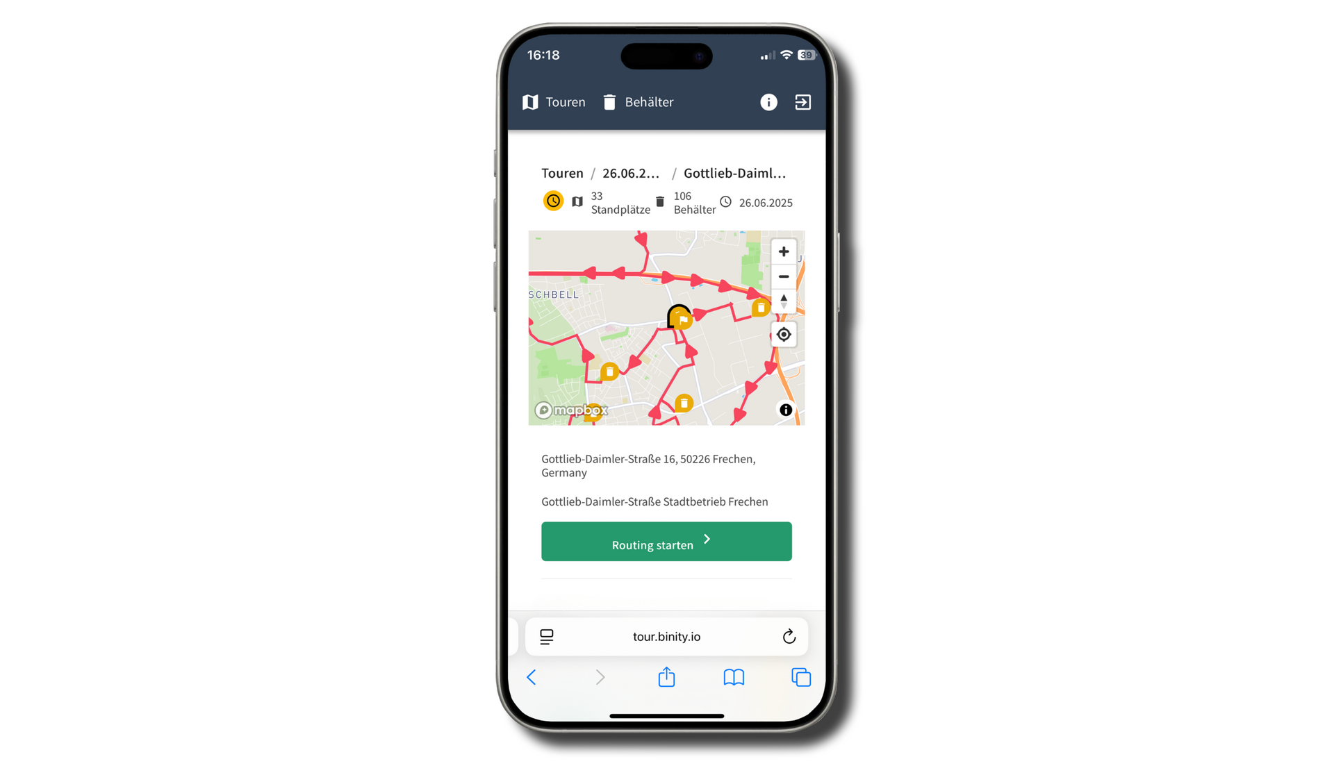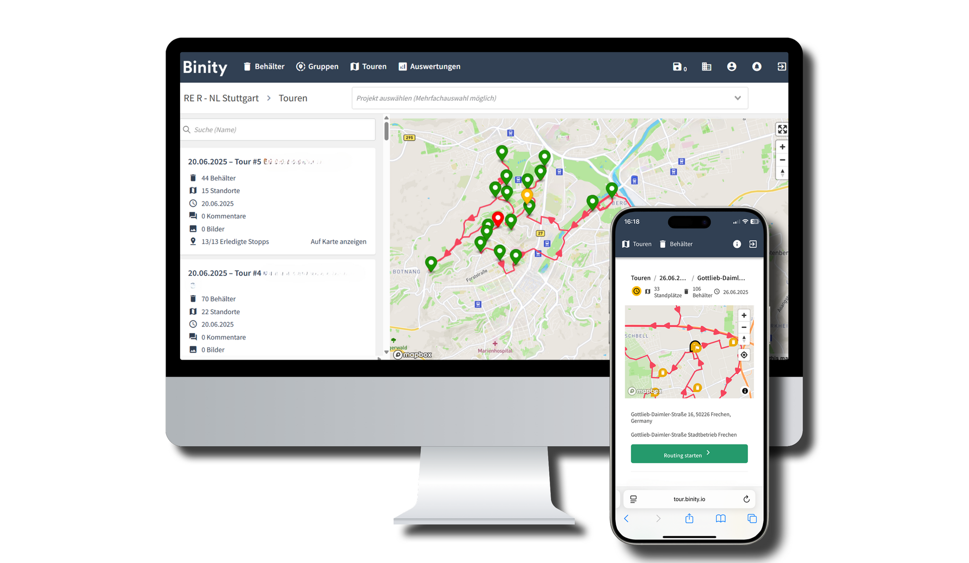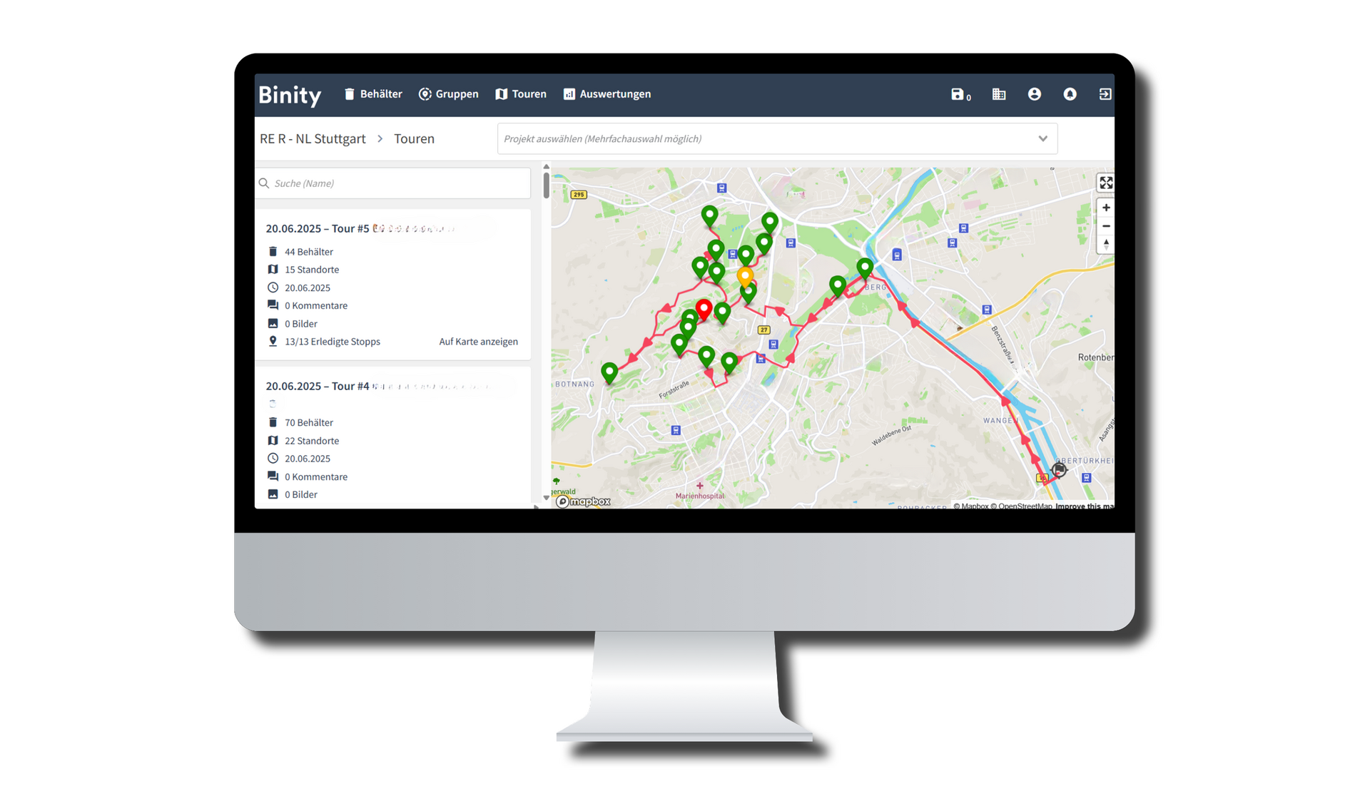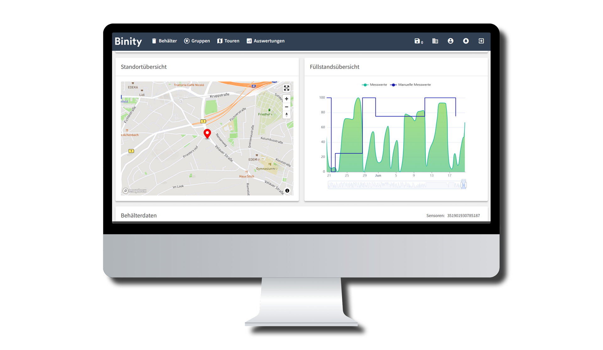 Über das Dashboard erhalten Sie in Echtzeit Rückmeldungen zum Tourstatus und zu den erfassten Füllständen der geleerten Behälter. Auf Basis dieser Daten zeigt Ihnen BINITY konkrete Optimierungspotenziale für eine effizientere Entsorgungslogistik auf.