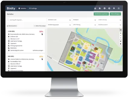 Wenn Container voll sind, müssen sie geleert werden. Was einfach klingt, wird zur Herausforderung, wenn zahlreiche Behälter an unterschiedlichen Standorten betreut werden müssen. Ob Depotcontainer, Abfallcontainer auf Industriegeländen oder Papierkörbe im städtischen Raum – BINITY sorgt dafür, dass der Leerungsprozess für unsere Kunden einfach, transparent sowie zeit- und kosteneffizient abläuft.